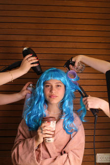 בסט הזה רציתי לשנות לדוגמנית שלי את צבע השיער לצבע לא רגיל. כדי לעשות זאת שמתי לה שתי פיאות (אחת ורודה ואחת כחולה). את הסט הזה צילמתי במספרה כדי להדגיש את עניין השיער ובנוסף השתמשתי בפרוזקטור. לפני הסט תכננתי כהמ דברים שונים אשר רציתי לצלם במספרה. הרעיון המרכזי שלי היה לצלם את הדוגמנית שלי כ"דיוה" שיהיו לה הרבה עוזרים וידיים סביבה שיתעסקו בה, כך שבהתחלה שמתי אותה על רקע חום אשר מתאים לחלוק החום שלה, ואנשים מסביבה החזיקו ספריי, פן, מחליק, רולרים לשיער וכו'. בנוסף צילמתי את הדוגמנית שלי מול המראה עם כל הציוד של הספר וגם בשטיפת שיער ושם שטפו לה את השיער (הפאה). קושי אשר נתקלתי בו הוא למצוא מספרה שתתאים לי ותסכים שאצלם בה. לפני שמצאתי את המספרה הזו דיברתי עם כל מיני ספרים אשר לא הסכימו שאגיע ו/או דרשו שאשלם להם כסף.